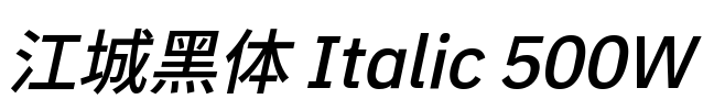 江城黑体 Italic 500W 字体基本信息字体名称: 江城黑体 Italic 500W字体子家族: Regular字体子家族 ID: JiangChengHeiTi-Italic-500W;Version 2.1字体全名: 江城黑体 Italic 500W字体版本: Version 2.1 2021/10/28字重信息: 500Pos…