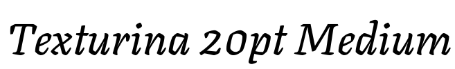 Texturina 20pt Medium 字体基本信息字体名称: Texturina 20pt Medium字体子家族: Italic字体子家族 ID: 1.002;OMNI;Texturina20pt-MediumItalic字体全名: Texturina 20pt Medium Italic字体版本: Version 1.002字重…