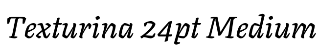 Texturina 24pt Medium 字体基本信息字体名称: Texturina 24pt Medium字体子家族: Italic字体子家族 ID: 1.002;OMNI;Texturina24pt-MediumItalic字体全名: Texturina 24pt Medium Italic字体版本: Version 1.002字重…