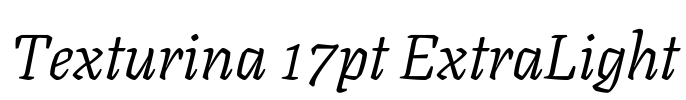 Texturina 17pt ExtraLight 字体基本信息字体名称: Texturina 17pt ExtraLight字体子家族: Italic字体子家族 ID: 1.002;OMNI;Texturina17pt-ExtraLightItalic字体全名: Texturina 17pt ExtraLight Italic字体版本:…
