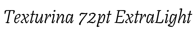 Texturina 72pt ExtraLight 字体基本信息字体名称: Texturina 72pt ExtraLight字体子家族: Italic字体子家族 ID: 1.002;OMNI;Texturina72pt-ExtraLightItalic字体全名: Texturina 72pt ExtraLight Italic字体版本:…