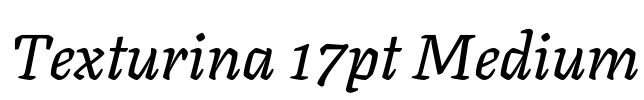 Texturina 17pt Medium 字体基本信息字体名称: Texturina 17pt Medium字体子家族: Italic字体子家族 ID: 1.002;OMNI;Texturina17pt-MediumItalic字体全名: Texturina 17pt Medium Italic字体版本: Version 1.002字重…