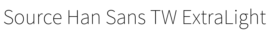 Source Han Sans TW ExtraLight 字体基本信息字体名称: Source Han Sans TW ExtraLight字体子家族: Regular字体子家族 ID: 2.004;ADBO;SourceHanSansTW-ExtraLight;ADOBE字体全名: Source Han Sans TW ExtraLi…