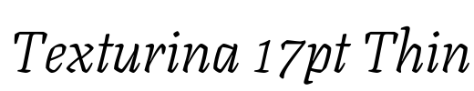 Texturina 17pt Thin 字体基本信息字体名称: Texturina 17pt Thin字体子家族: Italic字体子家族 ID: 1.002;OMNI;Texturina17pt-ThinItalic字体全名: Texturina 17pt Thin Italic字体版本: Version 1.002字重信息: 250P…