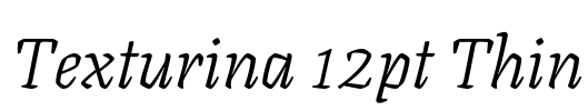 Texturina 12pt Thin 字体基本信息字体名称: Texturina 12pt Thin字体子家族: Italic字体子家族 ID: 1.002;OMNI;Texturina12pt-ThinItalic字体全名: Texturina 12pt Thin Italic字体版本: Version 1.002字重信息: 250P…